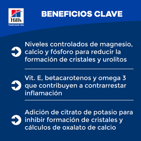 Alimento balanceado para gatos adultos coadyuvante en el tratamiento de enfermedades urinarias. Una vejiga sana empieza con el balance correcto de nutrientes vitales. El exceso de minerales puede favorecer la formación de cristales en la orina, lo que puede resultar en la creación de piedras en la vejiga. Pueden causar molestias y llevar a problemas más serios que requieren los cuidados de un veterinario. Usar solo según lo indique su veterinario. Cubra y refrigere la proción sobrante.