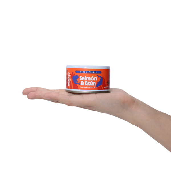 Alimento húmedo para gatos, completo y funcional. Rico en carne 100% de Salmón y Atún. Con aceite de salmón y vitaminas B1, B2 y B3. Ayuda a mantener la piel y el pelaje sanos, reduce problemas como la caída excesiva del pelo, caspa o prurito. Enriquecido con taurina, prebióticos y vitaminas. Libre de transgénicos. Con sello nutricional AAFCO.